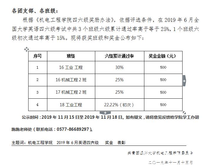 关于公布2019年6月全国大学英语四、六级考试获奖班级的通知