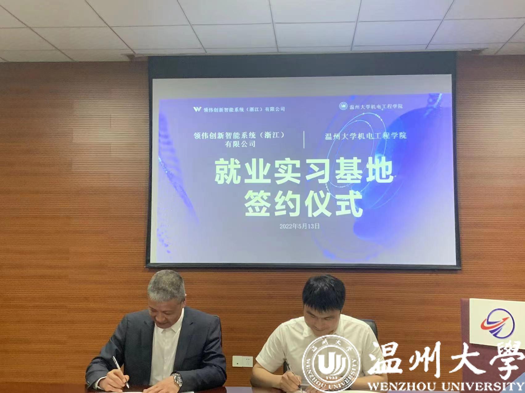 周荣书记、李小刚董事长代表校企双方签订就业实习合作协议,周荣书记向领伟创新智能系统(浙江)有限公司授牌,正式在该公司建设“永利集团就业实习基地”。