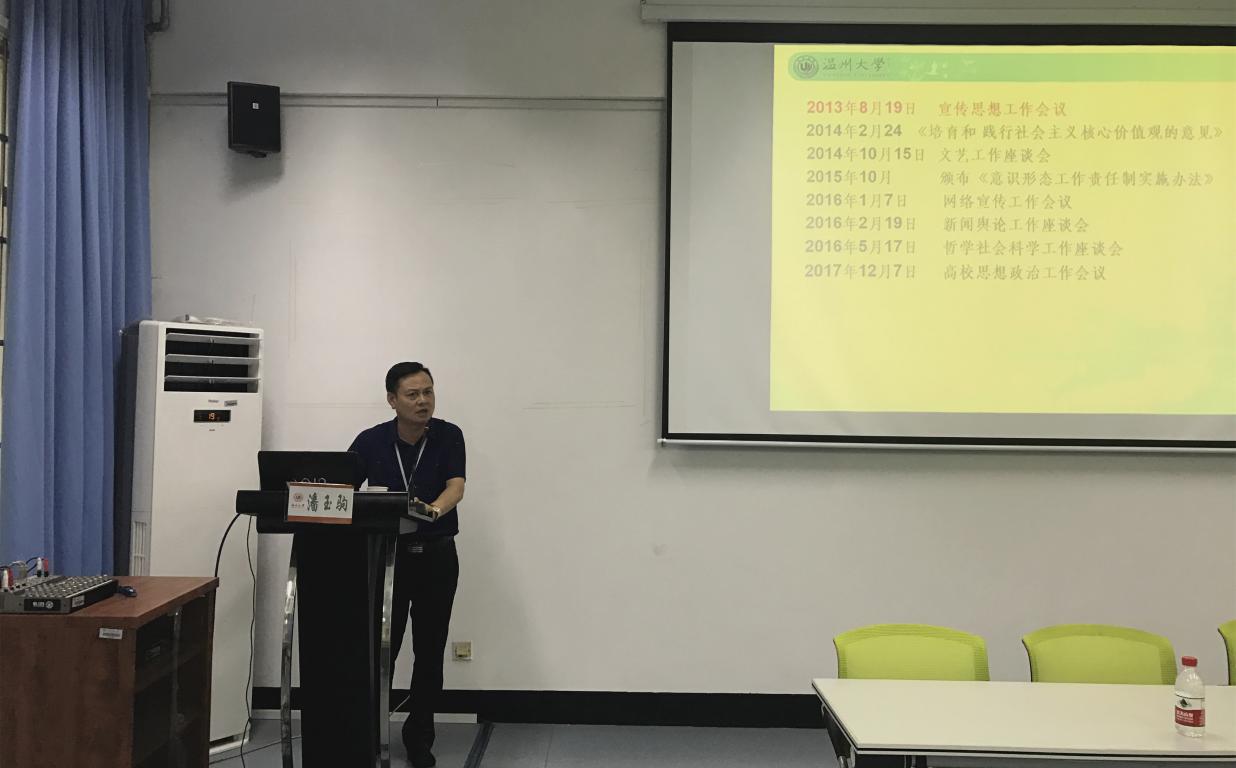 潘玉驹部长首先强调高校做好意识形态工作的重要性,他指出,高校要加强对意识形态工作的部署,时刻不能放松,广大教师要成为先进思想文化的传播者、党执政的坚定支持者。
