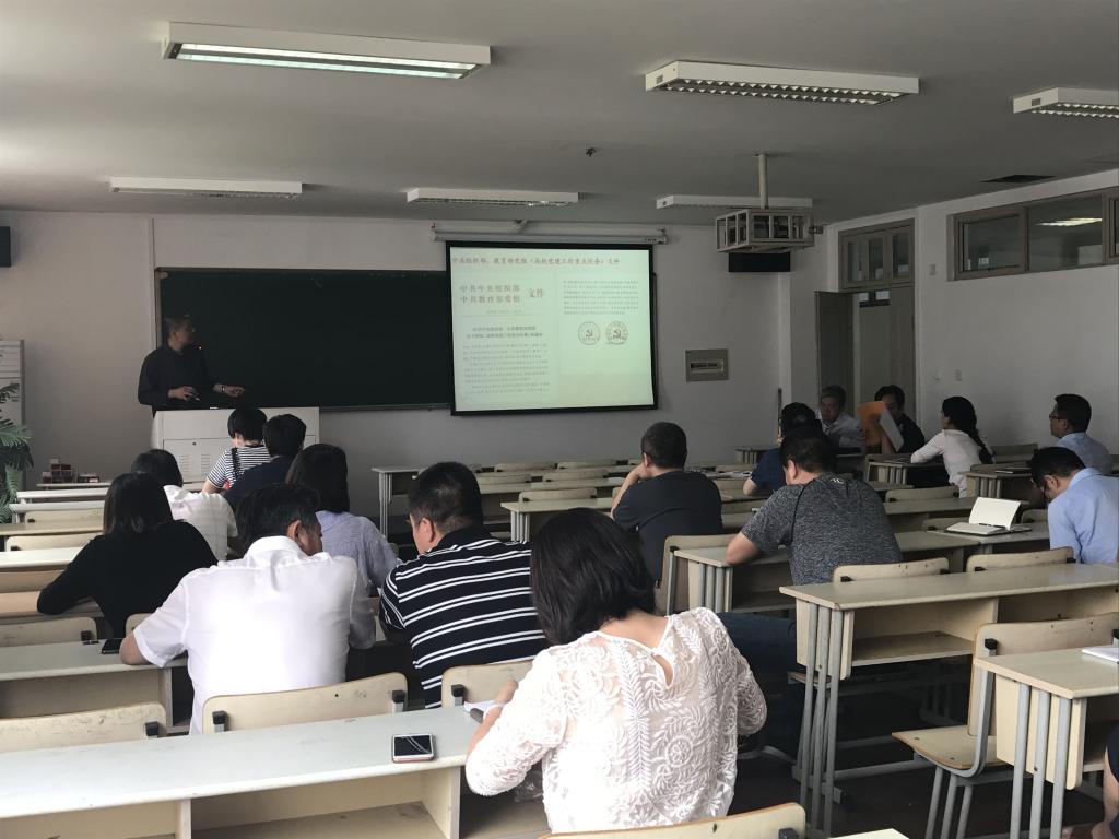 周荣书记首先带领大家学习中共组织部、教育部党组《高公司党建工作重点任务》文件并传达浙江省教育工委《关于做好近期几项基层党建重点工作》通知和温州市委组织部《全市基层党建工作重点任务清单》通知。他重点解读了重点任务中和公司紧密相关的任务:一、在教师引进、课程建设、教材选用、学术活动等重大问题上把好政治关;二、加强对教师、员工党支部工作指导;三、推进支部规范化建设;四、严肃党内政治生活;五、抓好党员发展工作;六、加强党员规范化管理;七、推进各级党组织书记抓党建述职评议考核全覆盖;八、强化党建工作保障。