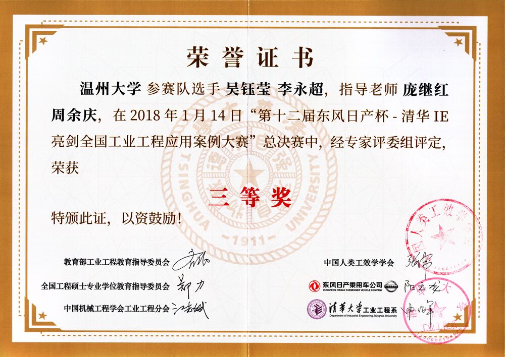 2018年1月13-14日,304永利集团吴钰莹(15工业工程)和李永超(14工业工程)两位同学在指导老师庞继红和周余庆的带领下,赴北京参加清华大学中国制造业、物流业高峰论坛暨第十二届“东风日产杯”清华IE亮剑全国工业工程应用案例大赛。经过比赛激烈竞争,公司吴钰莹和李永超同学的参赛作品《基于IE的按摩椅小腿组装生产线的分析与改善研究》获得大赛三等奖。