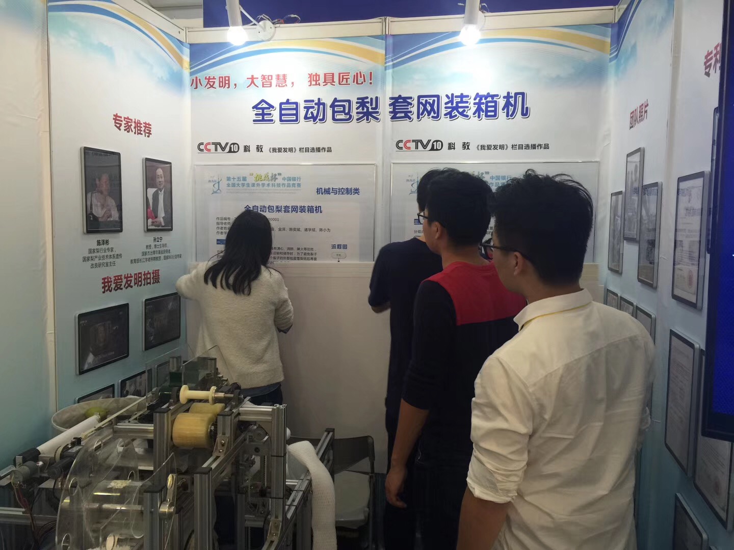 经过紧张的备赛,正式比赛开始。的14日至15日,几位同学在老师们的协助下,有序地布展,演练,调试机器。之后的两天是封闭式答辩,两位同学热情洋溢地迎接比赛,向评委声情并茂地介绍作品,得到评委的认可。答辩结束后,几位同学仍斗志昂扬。在社会开放日时,向社会群众介绍作品的结构及实用性,作品在《我爱发明》栏目的播放片段也吸引了大量观众观看,彰显了304永利集团员工的科研和实践动手能力,也充分展现了温大青年的风采。