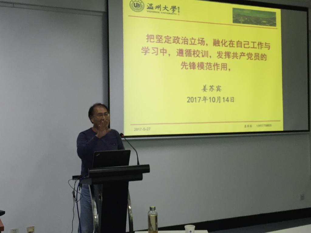 公司退休老领导姜苏宾老师为全体党员和入党积极分子作了《把坚定政治立场融化在自己工作与学习中,遵循校训,发挥党员的先锋模范作用》的报告,姜苏宾老师通过叙说公司的建立初期的艰苦过程,将“不忘初心”的含义讲解得淋漓尽致,告诫研究生党员要增强党员意识,并提出要提高学习能力、加强党性修养、继续学习党章的三项要求,做一个合格党员。