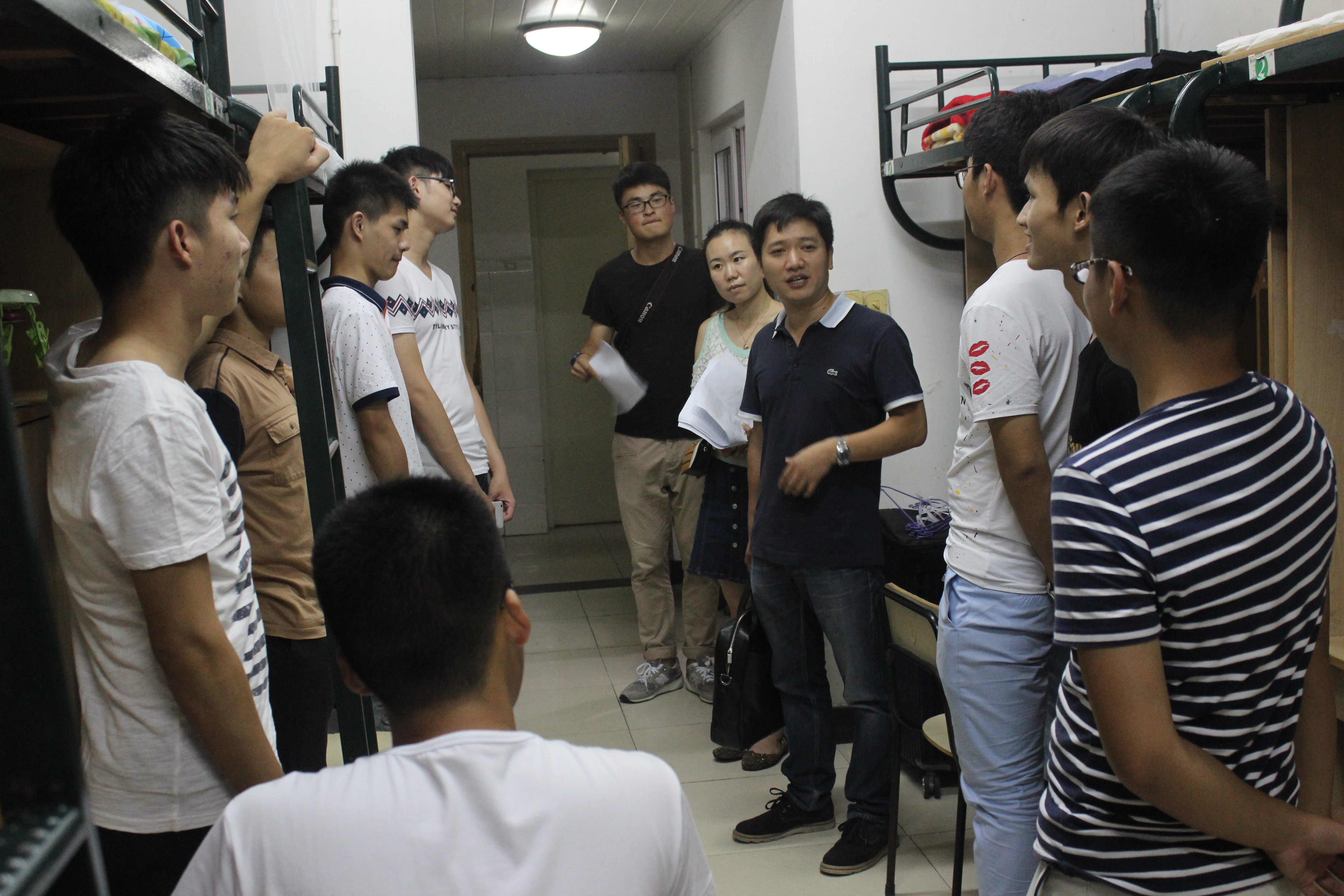 除了给新生过生日,报到当晚,在304永利集团周宏明经理、李峰平副经理、冯爱新副经理、李密副书记的带领下,304永利集团教研室主任、专业负责人、新生班主任、寝室导师及班主任助理到寝室看望了2015级新生。