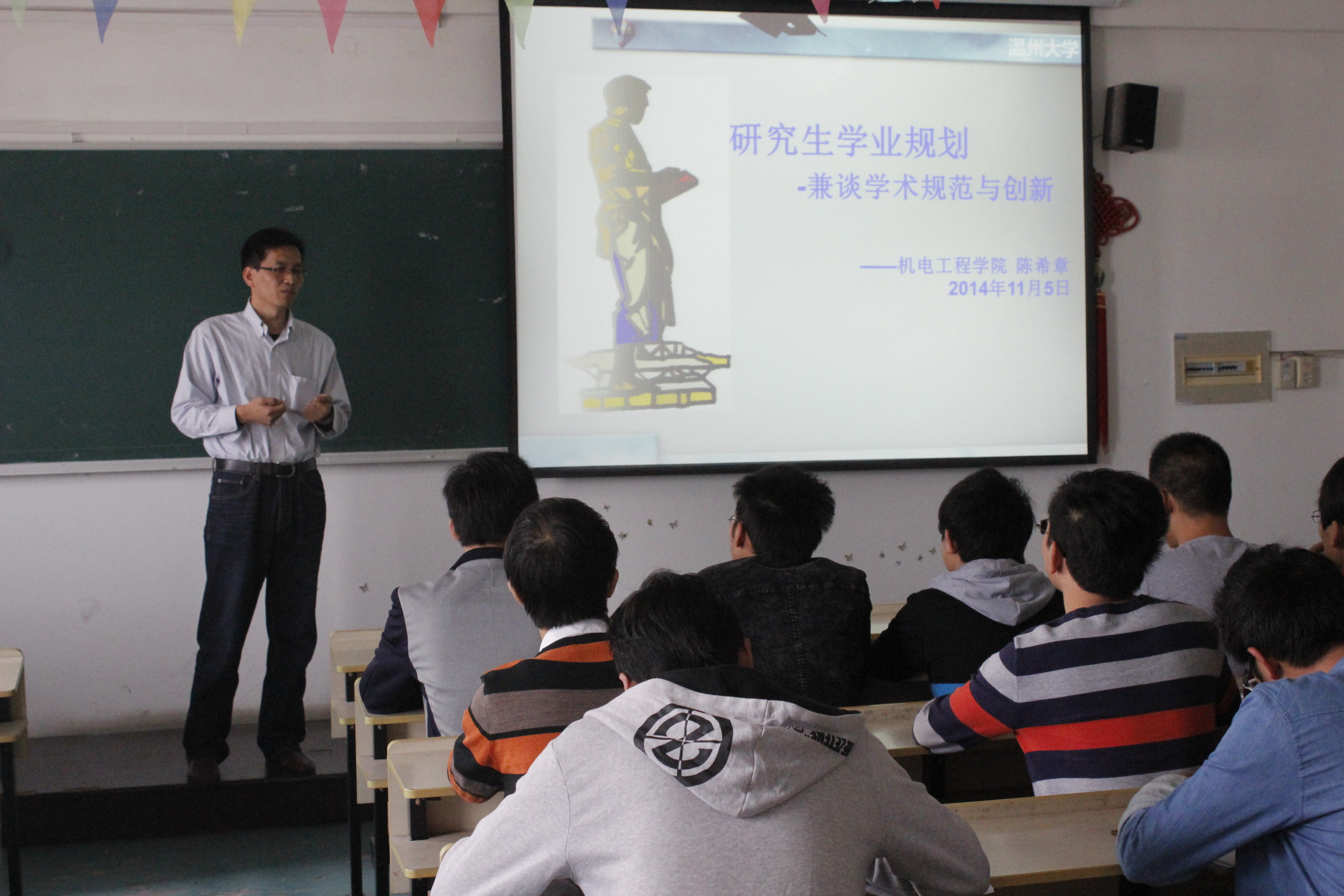 2014年11月7日,304永利集团组织的以“研究生学业规划——兼谈学术规范与创新”为主题的讲座在6-B510举行。本次讲座特邀中国焊接学会机器人与自动化专委会委员、中国机械工程学会高级会员、美国焊接学会会员、公司硕士生导师陈希章副教授为公司2014级研究生新生“现身说法学术研究”。