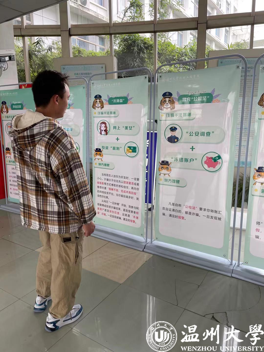 公司充分利用一楼大厅,向同学宣传展示网络贷款、网络刷单、“杀猪盘”、冒充“公检法”、“荐股”、冒充客服退款、虚假购物、注销“校园贷”、虚假购物买卖游戏币等十大高发校园通讯网络诈骗手段,并对诈骗手法进行解密,引导同学提高自我防范意识,一旦被骗,要及时报警。