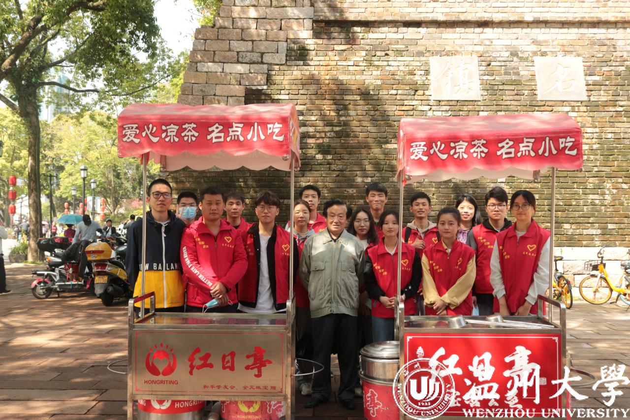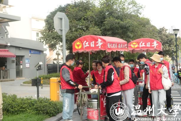 活动当天,在公司辅导员史凤娟、雷宏宇老师的带领下,10名预备党员和4名志愿者来到温州著名公益服务组织——红日亭。在与阿姨们的热情交流后,了解到当天的主要工作:推着红日亭特有的装有“红枣银耳羹”和“茯苓茶”的红色小车前往镇名广场、公园路街道等地向警察叔叔、环卫工人、过往的行人等免费派送。派送结束后回到红日亭,打扫干净红色小车和保温桶。在活动中传播“红日亭”的暖心善意,体现机电学子的爱心之举。