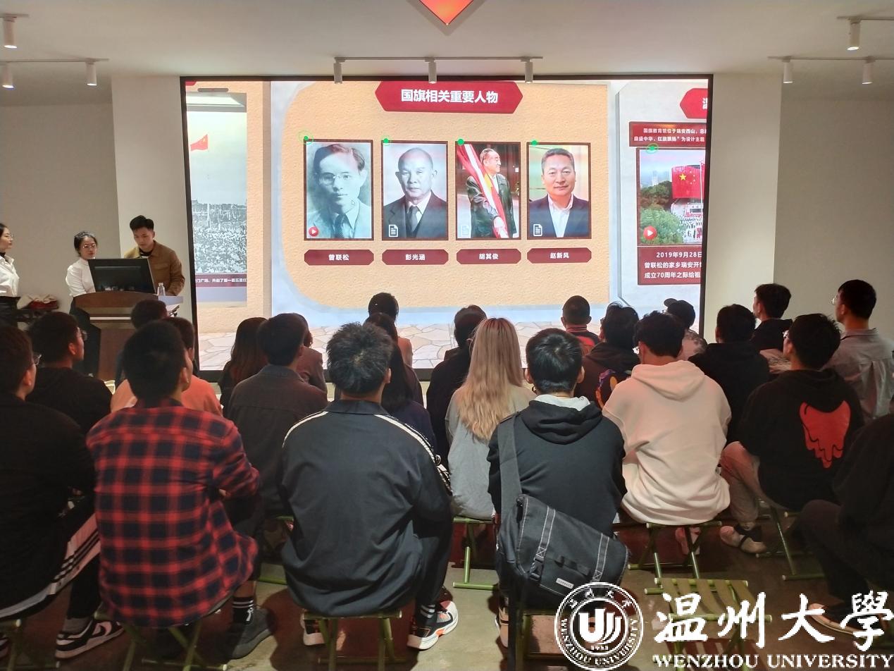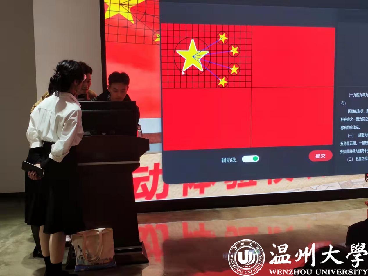 随后,为进一步增强广大党员同志的体验感,教育基地指导老师演示了虚拟板块的基本操作。本虚拟板块主要包括“走进马克思”、“中流砥柱”、“五星红旗”、“一带一路”等专题内容,可在虚拟仿真课堂中通过视频学习、交流互动、答题闯关等方式学习知识、场景体验。通过视频展示,讲解了关于五星红旗背后的故事。并且邀请研究生第一党支部书记姚旭凯体验制作国旗,本科生第二党支部书记黎雯婧感受虚拟场景的移动与知识竞答。这一全新的沉浸式的学习方式给在场党员同志不同于课堂上的感受,身临其境般感悟历史,提高了思政课的时代感和吸引力。