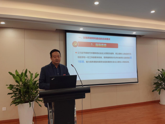 向家伟经理首先以《新时代师德师风建设》为主题作师德专题教育报告。向经理从加强师德师风建设的总体要求、全面加强教师队伍思想政治工作、大力提升教师职业道德素养、将师德师风建设要求贯穿教师管理全过程、着力营造全社会尊师重教氛围、推进师德师风建设任务落到实处等六个方面进行了全面的梳理和深刻的分析。他强调,要坚持思想铸魂,用习近平新时代中国特色社会主义思想武装教师头脑;要坚持价值导向,引导教师带头践行社会主义核心价值观;要坚持党建引领,充分发挥教师党支部和党员教师作用。他还通过典型案例分析,强调提升教师职业道德素养的重要性和紧迫性。