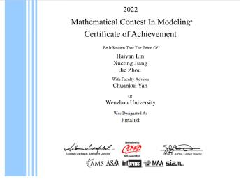 公司19工业工程班周洁与数理公司林海燕、计算机与人工智能公司蒋雪婷三位同学在数理公司严传魁、黄琼伟等数学建模指导老师的精心指导下,联合组队参加2022年美国老员工数学建模大赛(MCM/ICM),经过激烈角逐,从全世界2万多组选手中脱颖而出,成功斩获F奖(特等奖提名奖,占比约0.15%),也是今年永利集团本科生在美国老员工数学建模大赛中的最佳成绩。