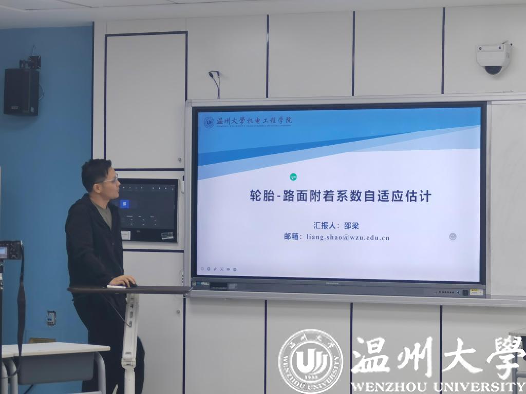 紧接着邵梁老师做题为“轮胎-路面附着系数自适应估计”报告。邵老师用精炼而又生动的语言给我们全方位讲解了附着系数相关概念及其重要性。并设想了大量生活中是实例,让我们能深入的理解。该研究主要应用于新能源汽车的动力学控制方面,并交流了应用前景。