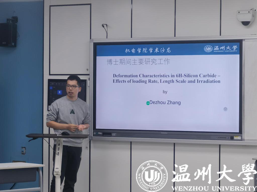 张德舟老师的报告题目为“6H碳化硅与不同加载率、长度尺观、辐照下的形变特征”,张老师以碳化硅材料为研究对象,深入的分析了材料的特性以及应用过程中的不足之处。从三个方面对其进行研究,研究在不同条件下碳化硅的形变特征及机理。与此同时,总结前人的研究成果,提出了自己的设想与展望。