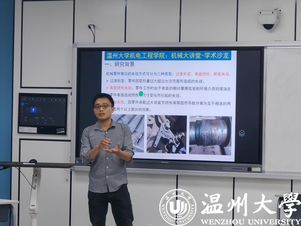 经主持人一番介绍后,本期学术沙龙就拉开帷幕。首先由尹美贵老师做主题为“机械零件的损伤行为研究”报告。多年来尹老师一直从事机械工程产品研发及服役行为研究工作,涉及装置研发、零部件表面处理及寿命预测等多方面的工作。他从三个不同的方面研究背景、研究现状、预期结果与展望阐述了研究工作的内容及应用前景。