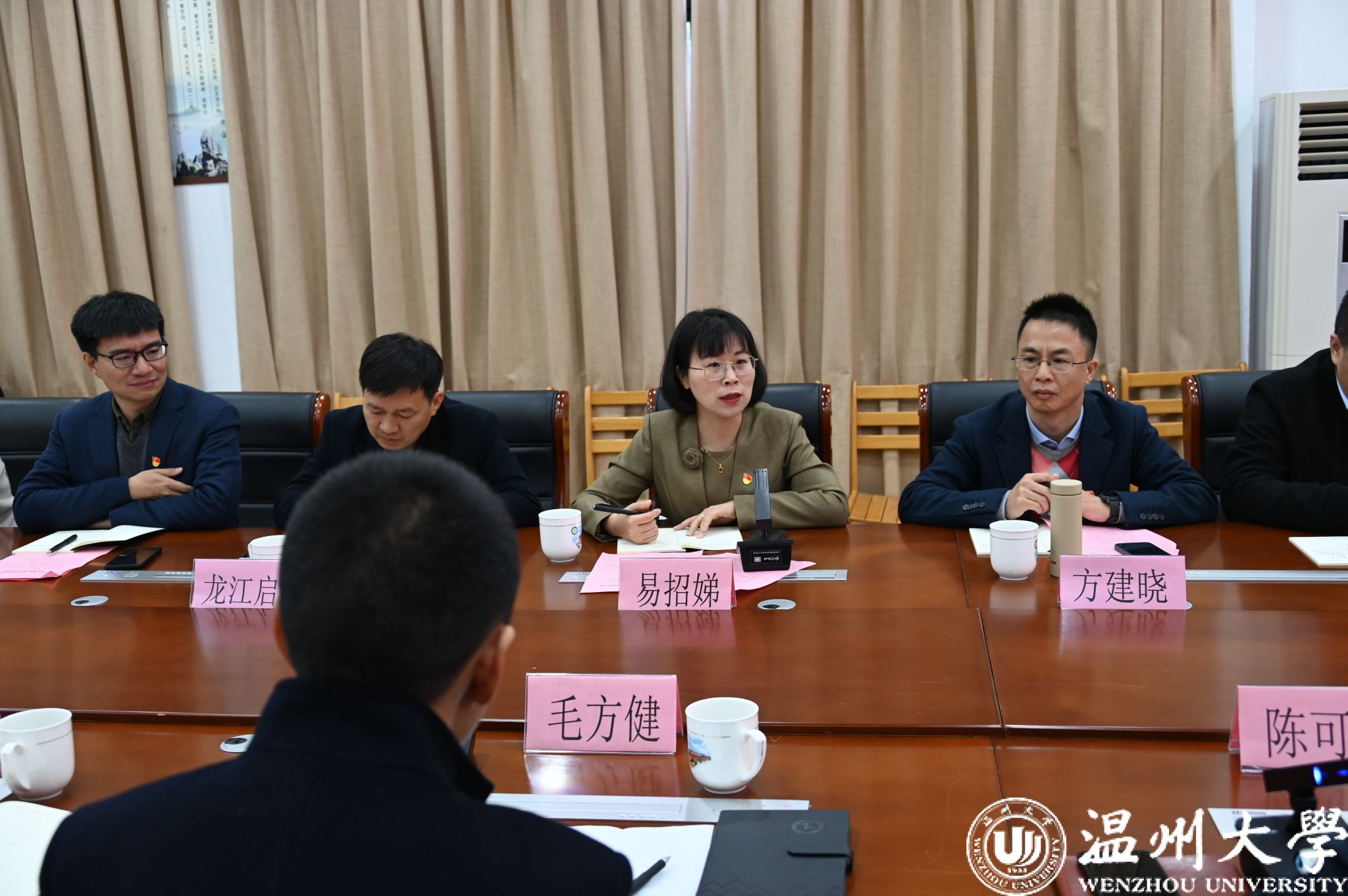 在交流环节,泰顺县人民政府办公室副主任毛方健、泰顺县职业教育中心党总支书记林盛祝分别对泰顺县和泰顺县职业教育中心的党建与专业建设情况做了讲解。304永利集团易招娣书记就泰顺县职业教育中心“3+2+2”办学、汽修专业申报建设、汽修实训中心建设等给出了指导性建议,并就团队、专业课程体系、培训实习等双方可能开展的合作方向进行了简要梳理。