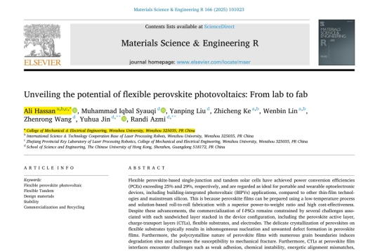 近日,公司外籍教师Ali Hassan博士作为第一作者兼通讯作者,在国际著名综述期刊《Materials Science & Engineering R: Reports》发表了题为《Unveiling the potential of flexible perovskite photovoltaics: From lab to fab》的长篇综述论文。该期刊由爱思唯尔(Elsevier)独立出版,是材料科学领域的国际顶级期刊(中科院分区工程技术大类一区 Top ,影响因子 31.6)。