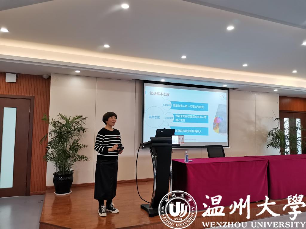 颁奖过后,由公司心理健康教育中心主任张海音老师向在场的老师进行了题为《辅导员心理助人谈话技能》的讲座。张海音老师是公司首席心理咨询师,心理咨询经验丰富,她通过多种实例,结合视频、个人经历为与会的老师们讲述了在与员工沟通时的事项以及多种谈话技巧。