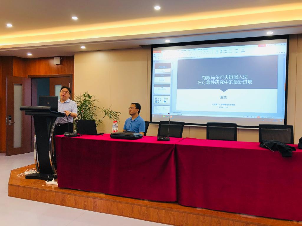 赵先教授首先为大家讲述了有限马尔可夫链嵌入法的发展趋势,并从树形或网络的可靠性分析、高维系统建模和可靠性分析、非马尔可夫相依情况下的可靠性分析、重要度研究、有限马尔可夫链嵌入法运算复杂度五个方面为现场师生进行了详细分析。随后,他为大家介绍了有限马尔可夫链嵌入法的最新应用,通过具体实例分析了“两态的启动验证试验模型”、“具有平衡调节运行机制的平衡系统”和“以失衡为失效准则的平衡系统”,简洁明了地说明了分析步骤和关键点,层层分析,逐步深入。