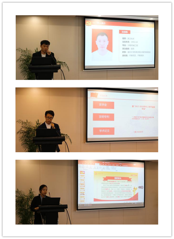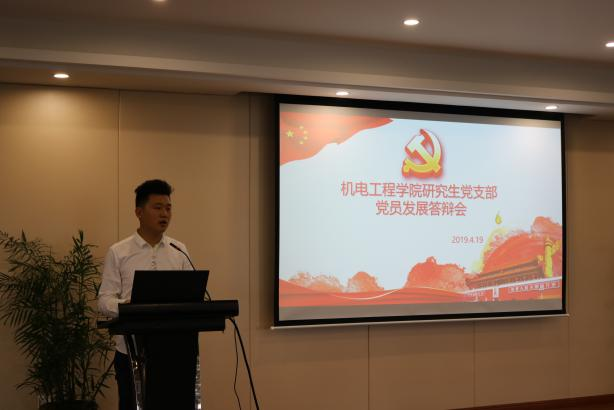 在研究生党支部副书记张玉朋介绍完公司党员发展答辩会制度实施办法之后,五位答辩人逐一展示了自己的答辩PPT,向党组织汇报了自己对党的认识,陈述了入党动机及自身表现,同时也就自身存在的优点和不足之处进行了深刻的分析,并明确了自己今后努力的方向。随后,在场的党员同志和评委客观公正地对答辩人进行提问,环节气氛活跃。