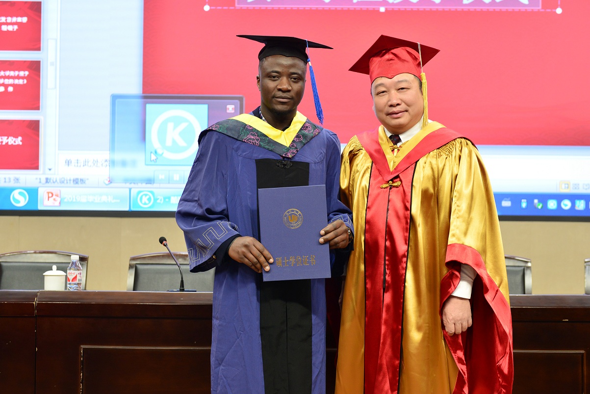 毕业典礼上,Mbah Collins Tebo怀着无比激动的心情走上主席台,从赵敏董事长手中接过学位证书,接受拨穗,并向赵敏董事长致握手礼,表达了他对永利集团的感谢之情。在与董事长合影的时候,他也获得了在场师生经久不息的掌声。这是他人生中值得永远铭记的时刻,同时也为难忘的研究生求学经历划上圆满的句号,从此开启了人生的新篇章。
