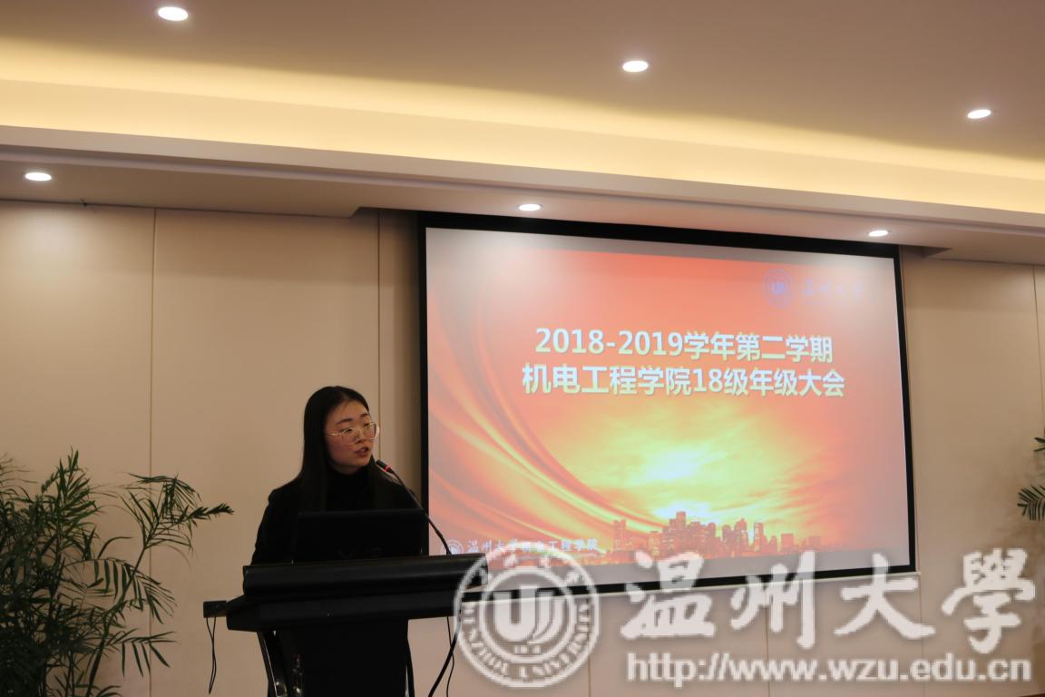 辅导员胡老师先介绍了本次年级大会召开的目的和意义,号召同学们要以饱满热忱的精神迎接新学期。随后胡老师分析了各班上学期获得班集体荣誉、各班上学期期末考试、四级考试、各班早晚自习、上课纪律等表现及问题,既肯定了18级同学在过去一个学期学风建设方面取得成绩也指出了还需改善的问题,并希望同学们予以重视。最后,胡老师希望18级同学每个人给自己定个目标,好好珍惜这4年宝贵的大学时光,充实自己,努力朝自己理想中的目标前进。