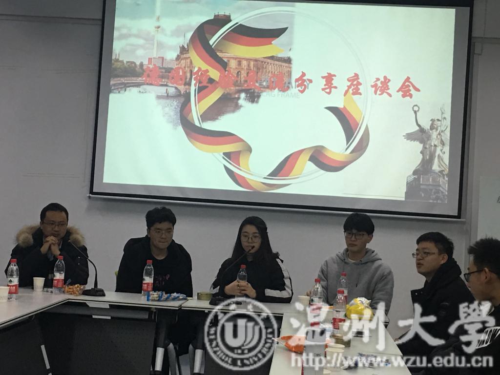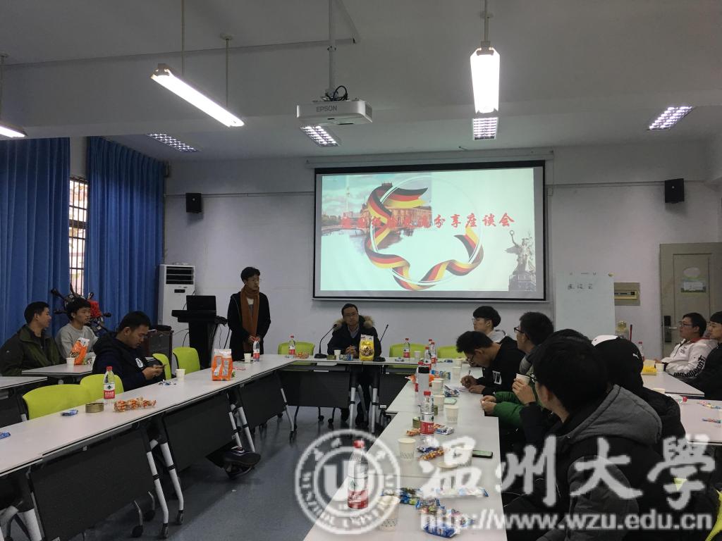 座谈会在主持人的陈词中正式开始。首先,储军老师以一份详细的ppt介绍了这项跨国学习项目,储老师从参加条件、项目内容、接轨的德国院校等方面分别对项目进行了详细阐述。紧接着,赴德员工精心准备的结业视频让大家对这项项目有了更充分的认识,视频中展示了员工们在德国的学习、生活等各个方面的经历。随后同学们边吃着准备好的甜品边与学长学姐聊天,大家畅所欲言,在德国的所见所闻所得成为了大家关注的焦点,也将会议推向高潮,其乐融融。