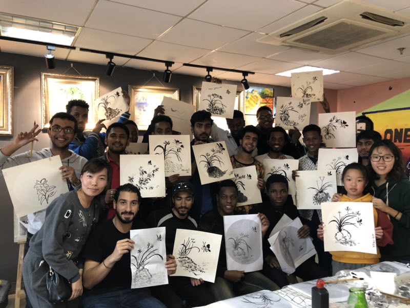 在绘画课开始之前,老师先让外国职工进行暖身活动——筷子夹弹珠。现场的同学们有说有笑、互动歌唱,氛围一下子活跃起来。随后正式开始国画教学,老师讲解完石头、兰花及蝴蝶这几个部分的画法之后,亲自为员工演示。外国职工认真投入,不少职工的作品收到了老师的赞赏。大家对此次绘画活动都表现出了极大的热情和喜爱。