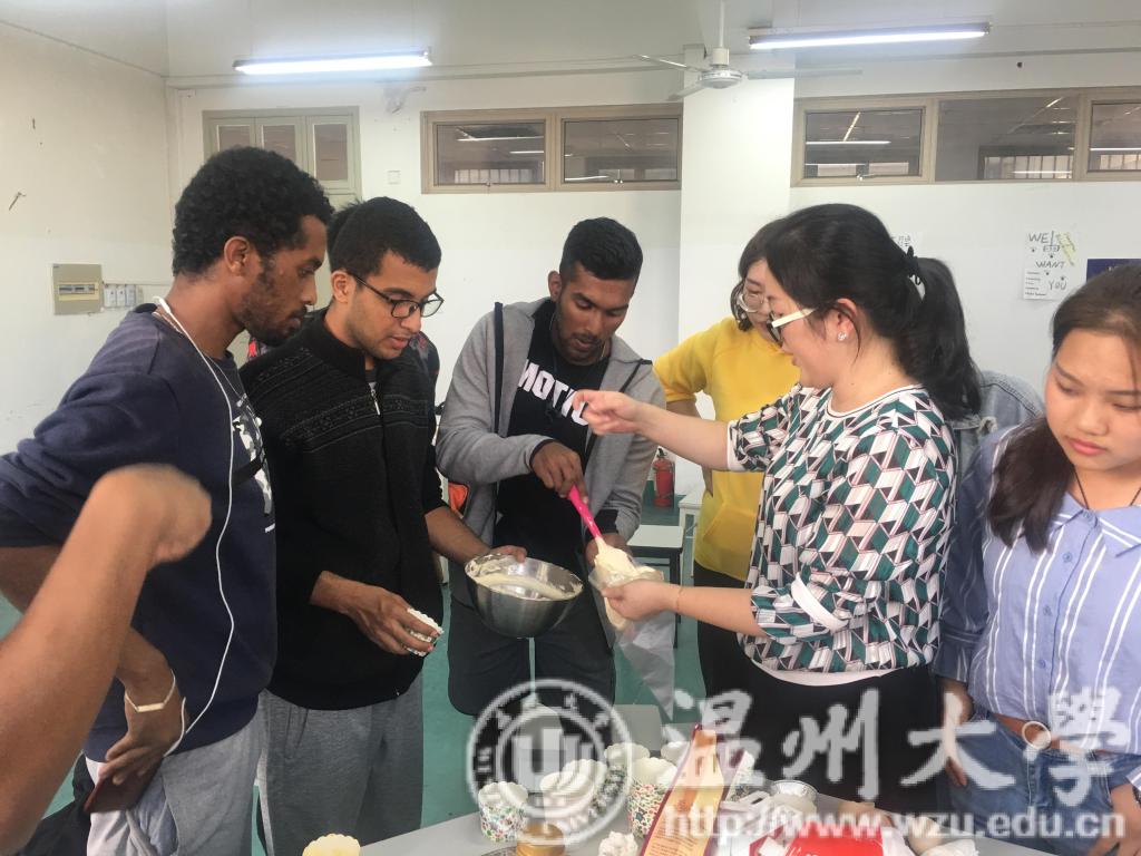 活动准时开始,王晓倩老师先给同学演示一遍蛋挞的制作方法,怀着跃跃欲试的心情,同学们认真仔细地制作手中的蛋挞。蛋挞出炉同学们都欢呼雀跃,为自己的劳动成果感到惊喜,并邀请老师们来品尝美味的蛋挞。活动期间,周宏明经理、周荣书记等老师也加入到活动当中来,品尝员工们制作的蛋挞。活动也吸引了外国员工,他们也饶有兴致的加入到制作队伍,王晓倩老师耐心细致的教外国友人制作纸杯蛋糕。