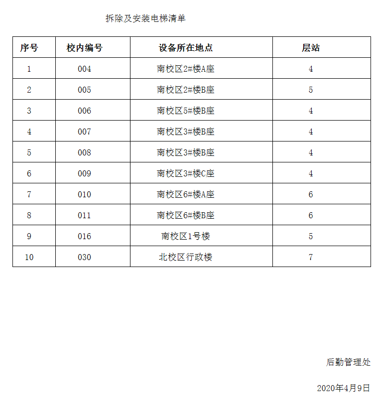 因公司老旧电梯更新工作需要,从4月11日(周六)起,逐步对以下电梯(详见清单)进行旧梯拆除及新梯安装施工,预计更新安装完成时间为5月中旬以前。届时,电梯安装位置有大型部件设备进出,电梯井道临时封闭。施工期间,请大家不要靠近电梯施工区域,以免发生危险。