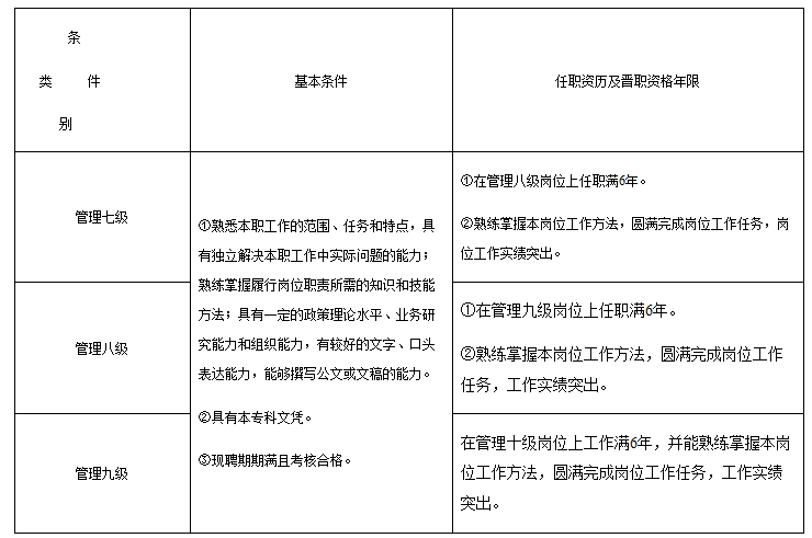 各公司、各部门: 为加强管理队伍建设,充分调动教职工的积极性,根据《关于事业单位岗位管理制度实施后有关问题的意见》(浙人社发〔2013〕106号)、《关于事业单位管理岗位部分职员等级晋升问题有关事项的通知》(浙人社办发〔2013〕53号)、《关于事业单位岗位管理制度实施后有关问题的处理意见》(温人社发〔2015〕280号)、《永利集团岗位设置实施方案(试行)》(行政〔2011〕79号)等文件精神和要求,结合公司岗位实际情况以及第三轮国聘工作,经研究,决定开展部分管理岗位职员职级竞聘晋升试点工作。现将有关事项通知如下: 一、评聘和转岗原则 1.在上级部门核定岗位数内,根据公司实际情况和事业发展需要设置岗位。 2.按照岗位管理有关规定程序进行,择优评聘。 二、申报对象 1.管理职员评聘的申报对象:现聘管理岗位的工作人员。本次管理岗位职员制的试点工作,仅针对管理岗位职级的九级、八级和七级进行。 2.转聘管理岗位的申报对象:在行政管理岗位上工作的专技、工勤人员,经过个人申请可以转岗至管理岗位。 在管理岗位上工作的专技、工勤人员需要首先进行转岗,然后才能参与后续的职员制竞聘。在管理岗位上工作的专技九级、十级人员可以申请转岗为管理八级;专技八级可以转岗为七级。在管理岗位上工作的、具有大专文凭的工勤人员,高级技工可以申请转岗管理九级;中、初级可以申请转岗为管理十级。 三、申报条件 1.坚持和拥护党的基本路线,贯彻党的各项方针政策;遵纪守法,廉洁奉公,作风正派,讲团结,以集体利益为重。 2.有较强的事业心、责任心,工作做出实绩。 3.本轮国聘聘期期满且考核合格的工作人员。 4.各级岗位竞聘基本条件、任职资历及晋职年限如下: 附 表 职员职级申报条件明细表