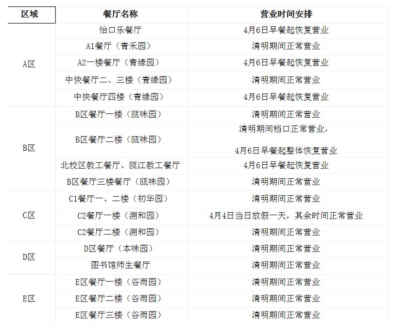 根据公司2021年清明放假的通知,2021年4月3日至4月5日为2021年清明假期,现将各餐厅营业时间安排通知如下: