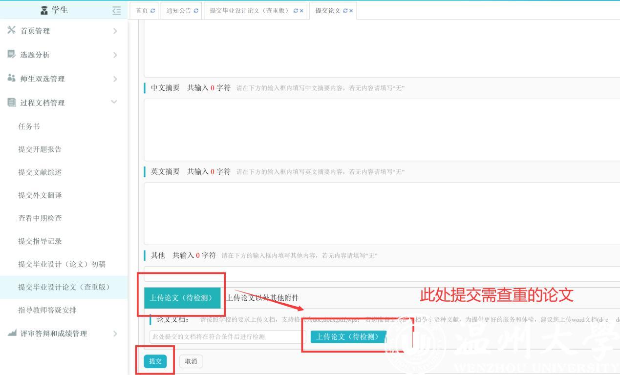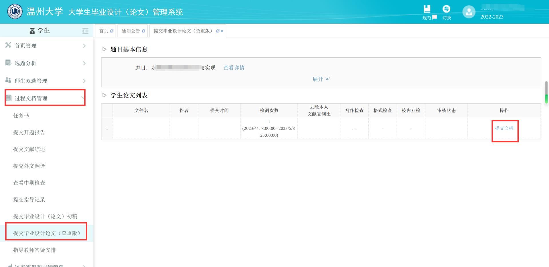 1. 员工登陆毕业设计系统,在过程文档管理——提交毕业设计论文(查重版),指导老师进行审核。
