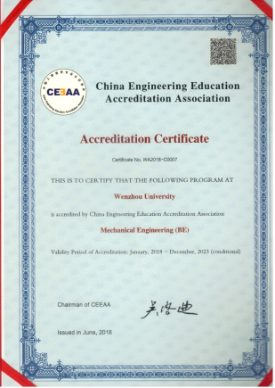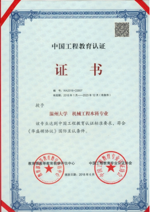 公司机械工程专业于2018通过中国工程教育认证协会的工程教育专业认证。通过专业认证,标志着本专业的质量实现了国际实质等效,进入全球工程教育的“第一方阵”,毕业生在《华盛顿协议》相关国家和地区申请工程师执业资格或申请研究生学位时,将享有当地毕业生同等待遇,为毕业生走向世界提供了国际统一的“通行证”。