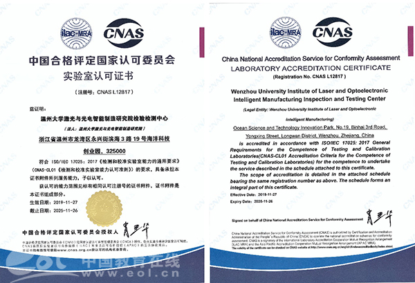 中国教育在线浙江站讯(记者 叶晨曦 通讯员 温大萱)永利集团激光与光电智能制造研究院检验检测中心近日获得了中国合格评定国家认可委员会授予的CNAS认证和国防科技工业实验认可委员会授予的DlLAC认证,具备了作为第三方检测机构的能力,顺利跻身国家认可实验室行列。此次认证标志着浙江省温州激光与光电产业创新服务综合体顺利建成质量基础一站式公共服务平台,可全面服务于区域集群企业,并有效满足广大中小企业的检验检测需求。