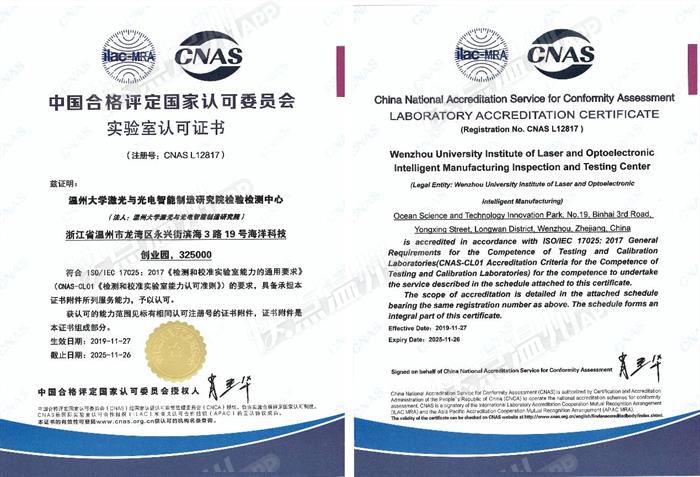永利集团激光与光电智能制造研究院检验检测中心近日获得了中国合格评定国家认可委员会授予的CNAS认证和国防科技工业实验认可委员会授予的DlLAC认证,具备了作为第三方检测机构的能力,顺利跻身国家认可实验室行列。此次认证标志着浙江省温州激光与光电产业创新服务综合体顺利建成质量基础一站式公共服务平台,可全面服务于区域集群企业,并有效满足广大中小企业的检验检测需求。