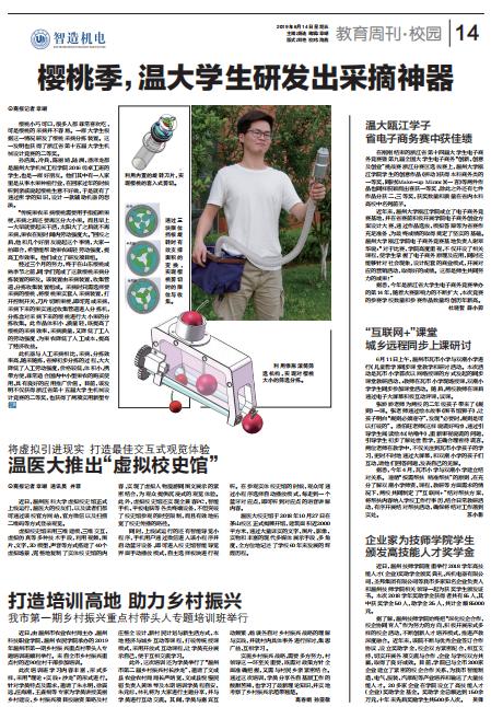 “传统果农采摘樱桃需要用手指掐断果梗,采摘之后还要再区分大小果。而且早上一大早就要起床干活,太阳大了之后就不再采摘,果农在短时间内劳动强度大。”回校之后,他和几个好朋友说起这个事情,大家一拍即合,希望能帮助果农减轻劳动强度、提高工作效率。他们成立了研发项目组。