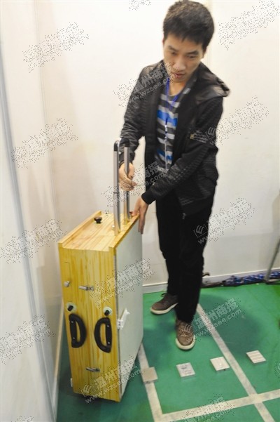 一个男生拉着一个木制行李箱在走,不过这可不是旅行箱,而是属于机械类专业老员工的便携式多功能制图桌。设计者王林介绍说,机械类专业员工学习离不开制图桌,但传统制图桌占用空间大,搬运不便,高度固定,实际运用起来还存在诸多不便。为此,他们设计了这种可携带的多功能制图桌。不但桌腿可折叠可升降,配上滚轮、拉手、提手,制图桌也能快速折叠成行李箱,说走就走。