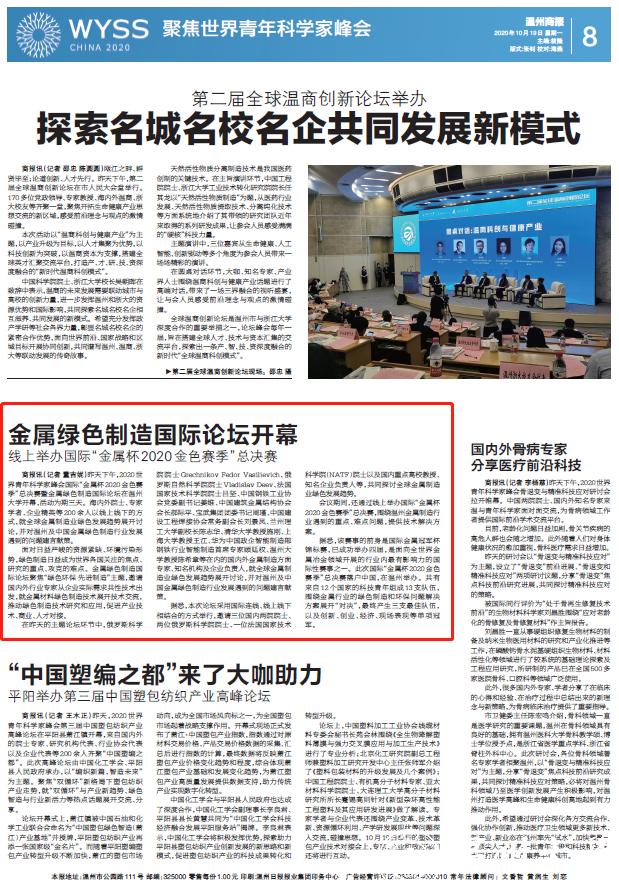商报讯(记者 董吉妮)昨天下午,2020世界青年科学家峰会国际“金属杯2020金色赛季”总决赛暨金属绿色制造国际论坛在永利集团开幕,活动为期三天。海内外院士、专家学者、企业精英等 200 余人以线上线下的方式,就全球金属制造业绿色发展趋势展开讨论,并对温州及中国金属绿色制造行业发展遇到的问题建言献策。