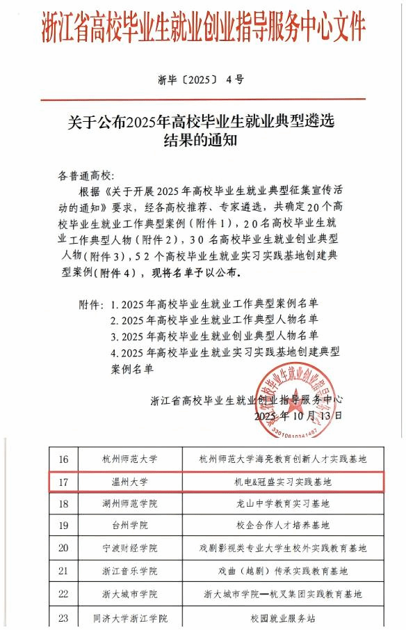 在近日公布的“2025年浙江省高校毕业生就业典型遴选结果的通知”中,304永利集团报送的“机电&冠盛实习实践基地”成功入选2025年高校毕业生就业实习实践基地创建典型案例,为公司今年唯一获此荣誉的基地申报案例。