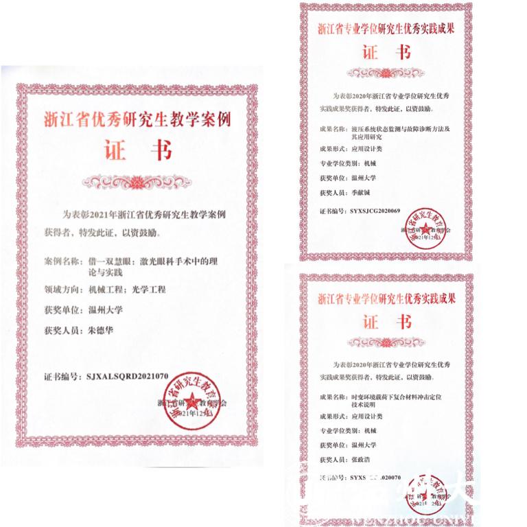 此外,还有两位同学荣获2020年浙江省专业学位研究生优秀实践成果,分别是2017级专硕季献铖同学的《液压系统状态监测与故障诊断方法及其应用研究》(导师:任燕、李勇(小))、2017专硕张政浩同学的《时变环境载荷下复合材料冲击定位技术说明》(导师:钟永腾)。