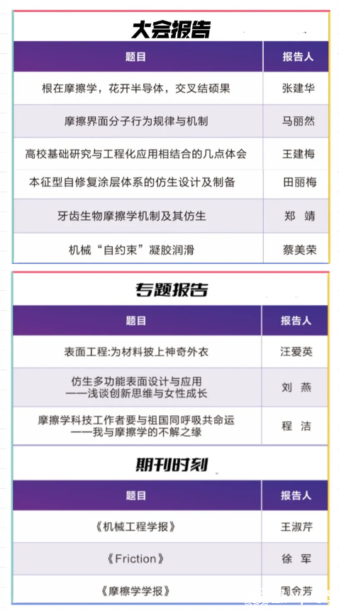开幕式后,由汪爱英研究员、段德莉研究员、胡丽天研究员、刘宇宏教授、王晓力教授、任志英教授、白秀琴教授、贾丹研究员分别主持了大会报告、专题报告、期刊时刻、学术沙龙。上海大学张建华教授、清华大学马丽然副教授、山西工程技术公司王建梅教授、吉林大学田丽梅教授、西南交通大学郑靖研究员、中国科公司兰州化学物理研究所蔡美荣研究员受邀做大会报告;中国科公司宁波材料所汪爱英研究员、吉林大学刘燕教授、中国矿业大学(北京)程洁教授受邀做专题报告;本次论坛设立了《编辑时刻》,《机械工程学报》常务副主编王淑芹高工、《Friction》期刊副主编徐军教授、《摩擦学学报(中英文)》责任编辑周金芳教授受邀做期刊报告。论坛设立了《学术沙龙》,摩擦学女科技工作者与大家分享女科技工作者科研之路。并邀请永利集团蒋胜男教授做了文学讲座。
