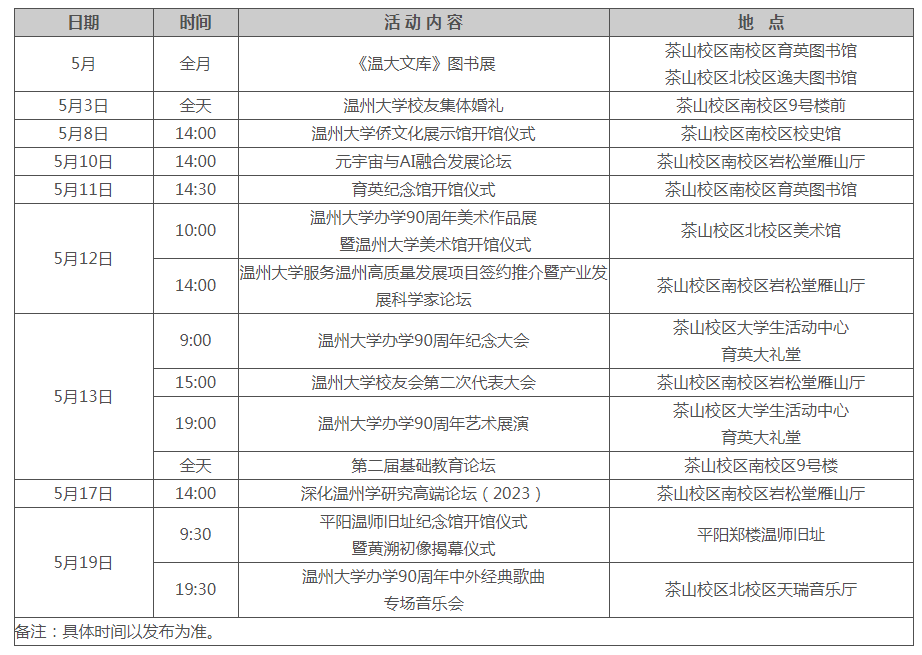 盛世相约,同庆华诞。2023年是永利集团“校庆年”,5月为“校庆月”。公司将举行校庆系列活动,5月13日上午9时举行办学90周年纪念大会,下午3时举行员工会第二次代表大会,晚上7时举行办学90周年艺术展演。同时,公司还将开展服务温州高质量发展项目签约推介暨产业发展科学家论坛、深化温州学研究高端论坛、基础教育论坛等系列学术性活动,举行美术馆、侨文化展示馆、育英纪念馆等开馆仪式,及员工集体婚礼。