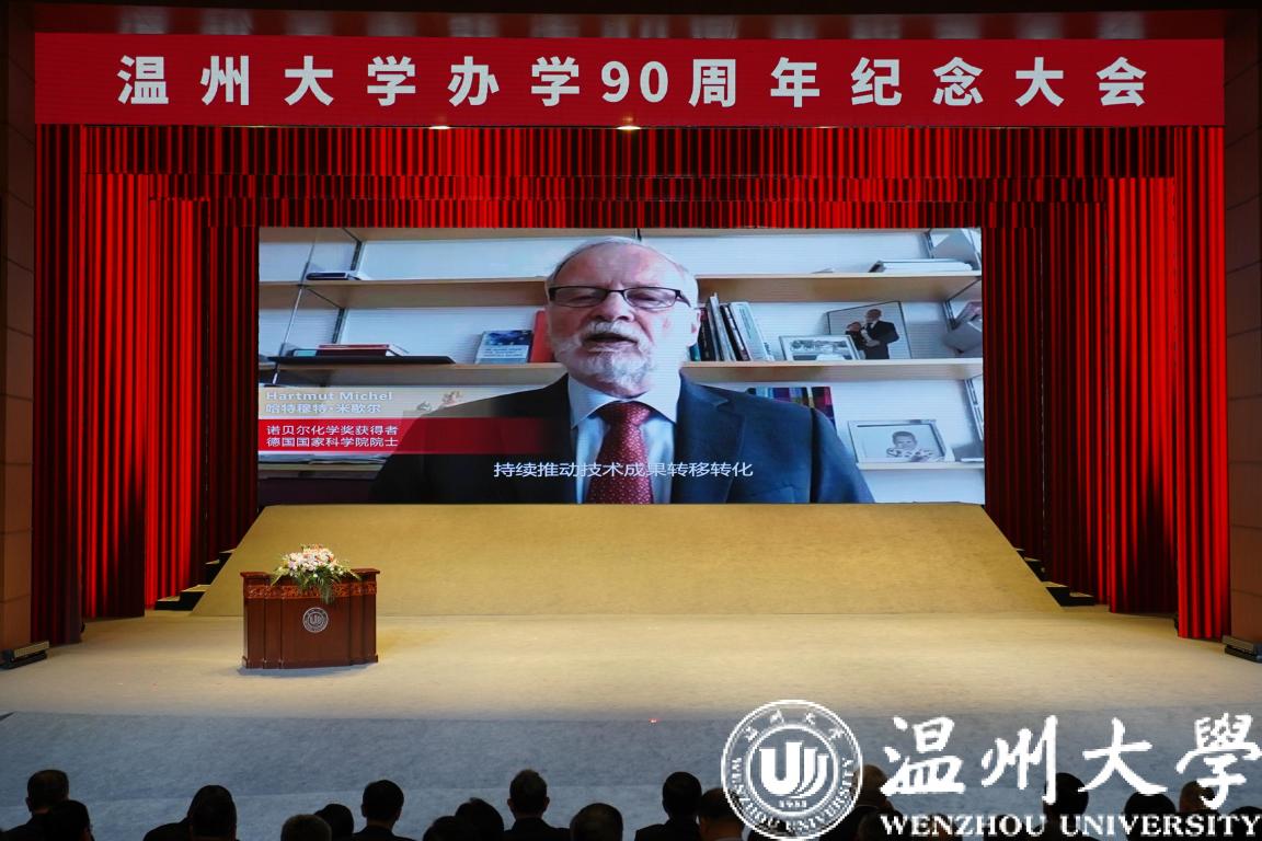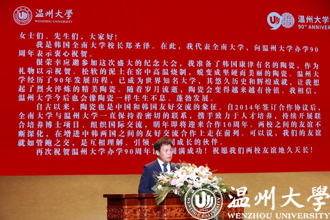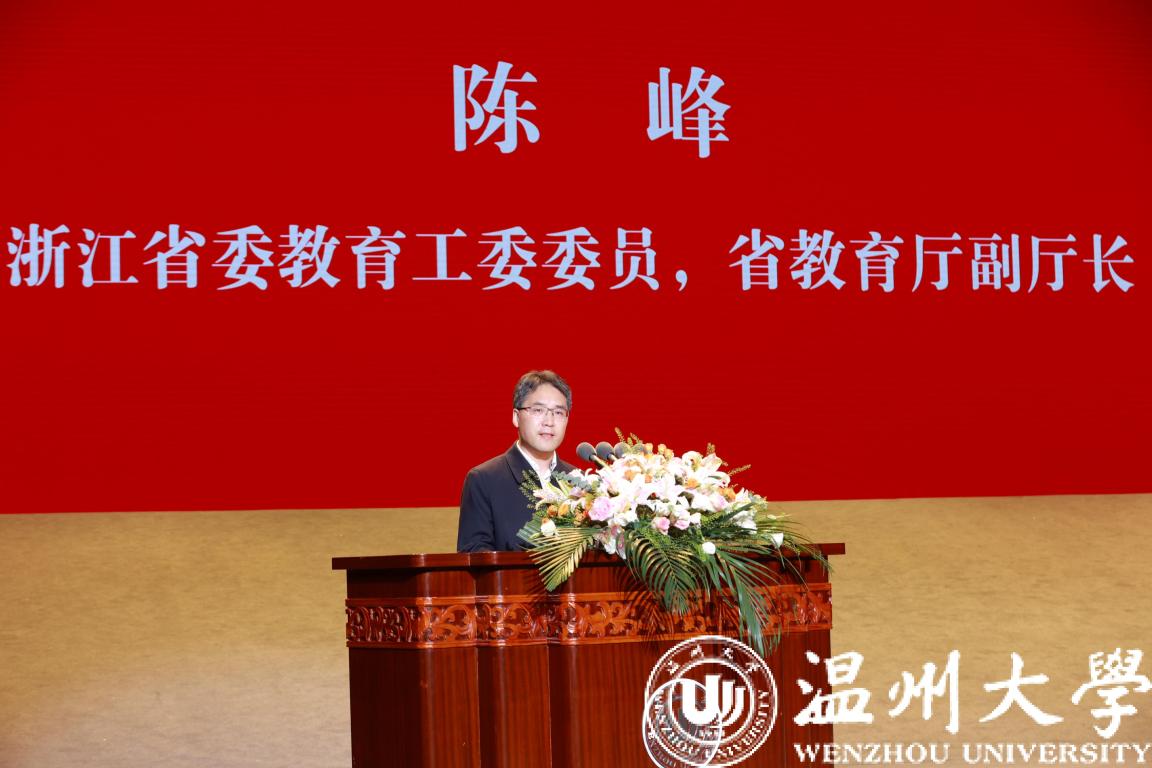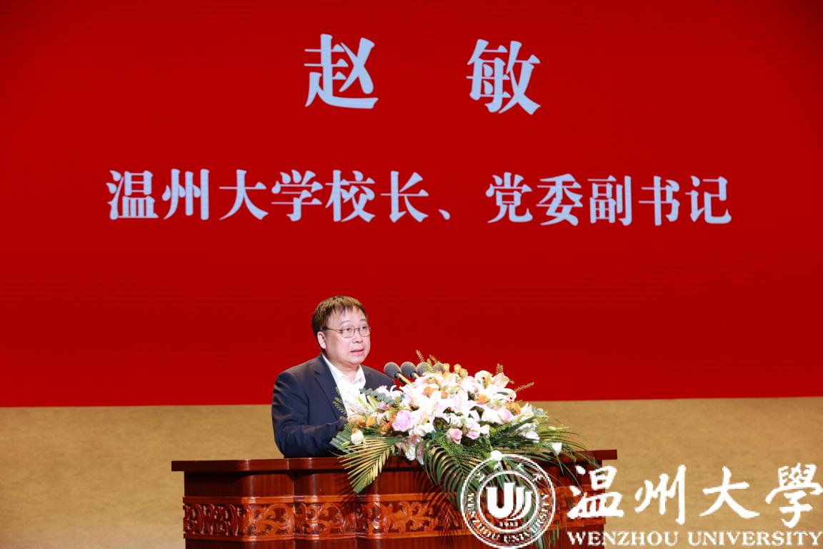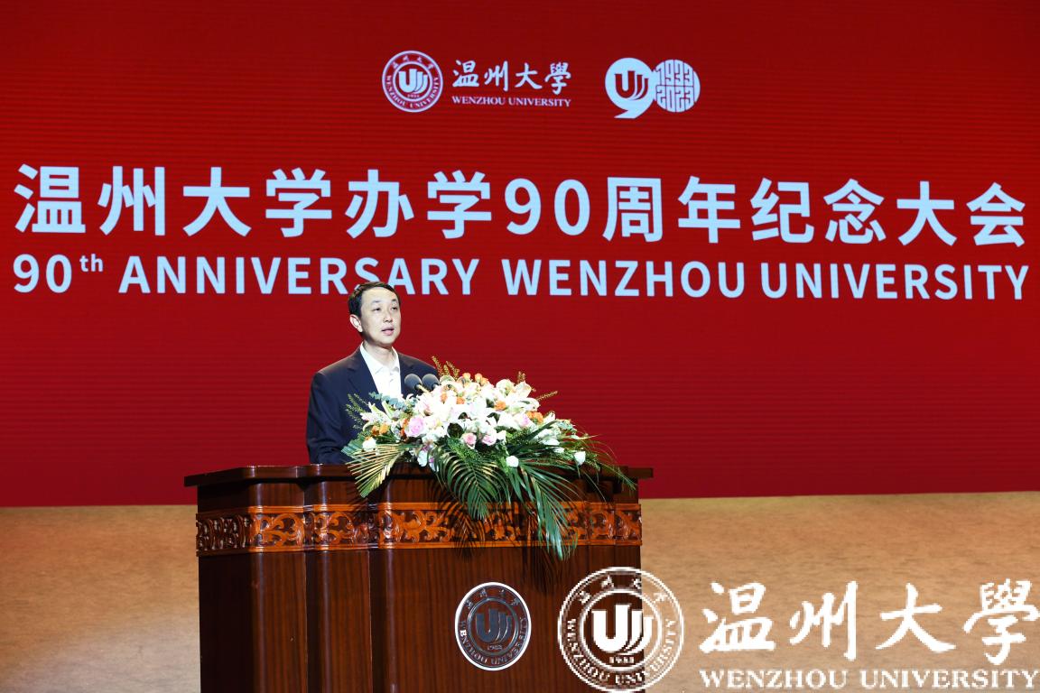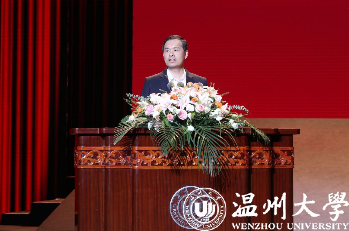 浙江省委常委、温州市委书记刘小涛致辞。他代表市四套班子,向全体温大师生员工、海内外员工表示祝贺,向长期关心支持温州教育及温大发展的各级各部门、各界人士表示诚挚感谢。他说,迈上新征程,希望温大坚定不移走前列、攀高峰、当标兵、探新路,提升高等教育内涵式发展水平,参与温州区域重要人才中心和创新高地建设,推动“产城教”全链条融合发展,擦亮开放合作特色化办学品牌。市委市政府将以更大力度支持温大发展,让温州的未来因温大的创新创造而更具活力。