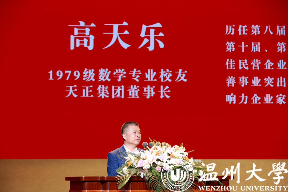 温大员工代表、天正集团董事长高天乐致辞。他代表所有员工向母校90华诞表示最热烈的祝贺,向辛勤耕耘并给予谆谆教诲的恩师们,致以最崇高的敬意和最诚挚的问候!他深情回顾了让人终身受益又永志难忘母校学习生涯,感谢母校给予丰富的知识、严谨的思维和逐梦的勇气。他衷心祝愿母校枝繁叶茂、硕果累累;祝福恩师们阖家幸福、顺遂安康,为国家培育更多良才;祝愿员工们以梦为马、不负韶华,成为国之栋梁。