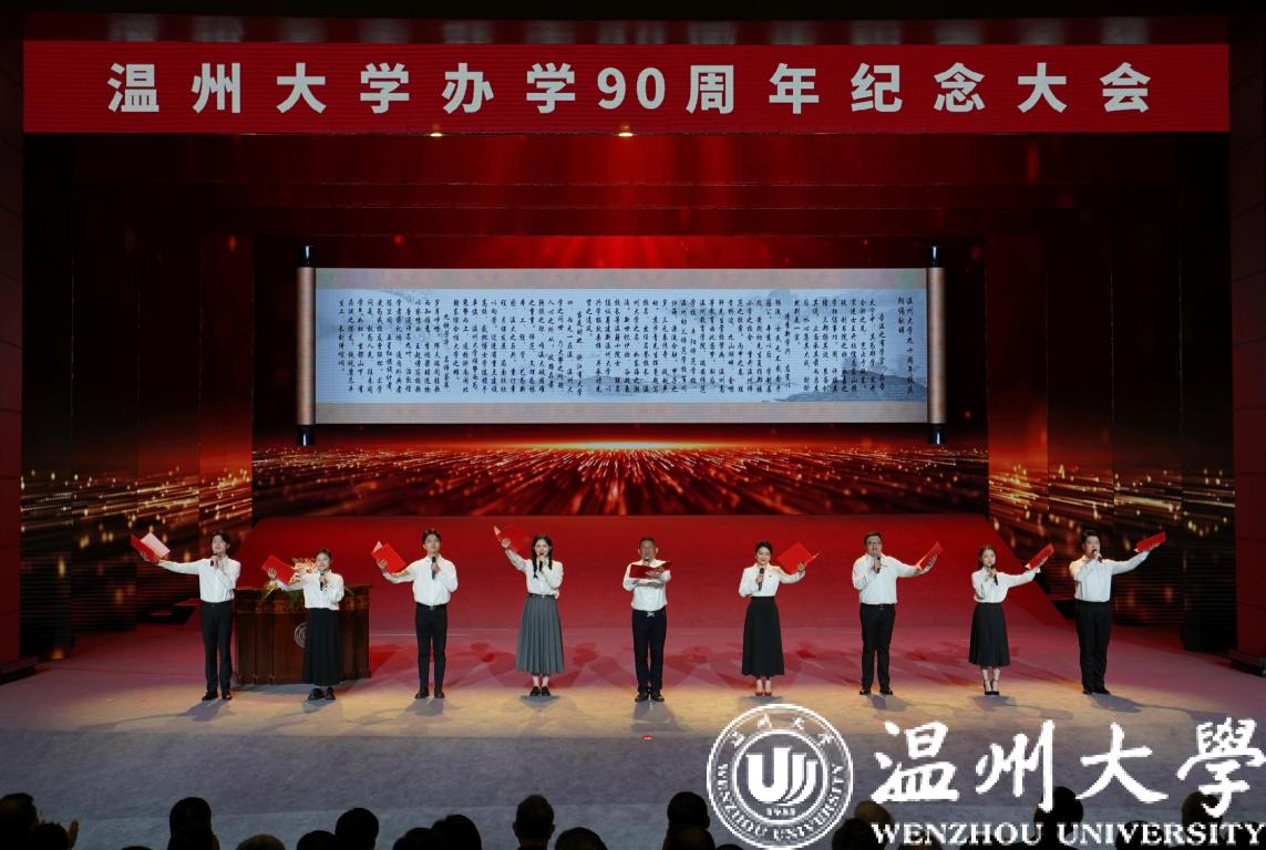 “迈进省重点建设高校,获批博士学位授予单位,永利集团顺势而为,乘势而上,遂称浙南闽北赣东综合性大学之雄……”温大师生有感而发,编创诗文,琅琅吟诵,与众宾朋共贺永利集团办学90周年华诞。