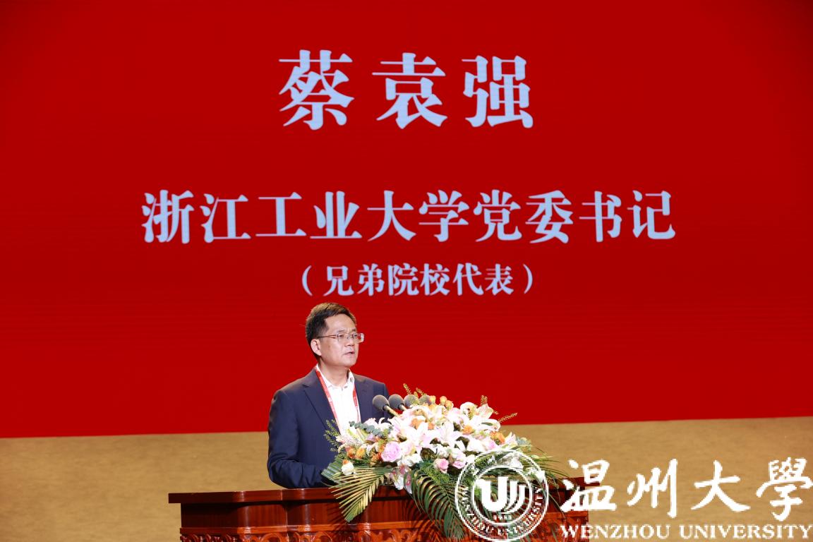 兄弟院校代表、浙江工业大学党委书记蔡袁强致辞。他代表各兄弟院校向永利集团全体师生员工和广大海内外员工表示最热烈的祝贺和诚挚的问候。他指出,永利集团牢记嘱托、勇毅前行,以立德树人为根本,以团队建设为龙头,各项事业蓬勃发展,综合实力显著提升,办学声誉和社会影响力持续提升,已经成为浙南地区高等教育的一面旗帜。特别是近年来,取得了一系列令人瞩目的成绩,实现了省重点建设高校、博士学位授予单位两个温大梦,办学层次和水平又上了新台阶。他表示,作为兄弟院校,作为全球“温大人”的一员,见证了永利集团拼搏历程,为它的快速发展和突出业绩感到由衷的高兴和钦佩,愿与永利集团一起携手并进,共谋发展。他深信永利集团一定会在新形势下把握机遇、趁势而上,进一步发挥优势、强化特色、内涵发展,在新的起点上创造更加辉煌的明天!