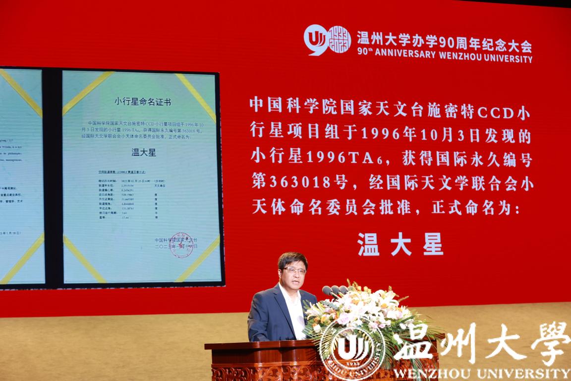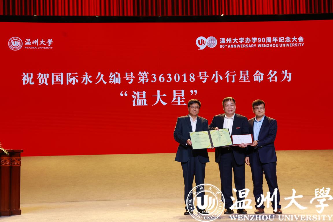时值办学90周年,公司欣喜地收到国家天文台赠予的厚礼:一颗小行星命名为“温大星”。大会举行了永利集团小行星命名仪式。国家天文台原副台长、巡天观测研究团组首席研究员薛随建宣读“温大星”命名公报和命名证书,并与“温大星”发现者代表、国家天文台研究员邹虎共同向董事长赵敏颁赠“温大星”命名证书和运行轨道铜牌。“温大星”遨游苍穹,将持续激励全体温大人厚植家国情怀,仰望星空,脚踏实地,勇毅前行。