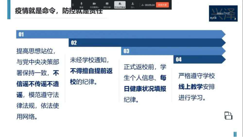 此次网络主题班会主要围绕寒假生活学习情况交流、新冠肺炎疫情防控知识、疫情引发老员工的思考、爱国主义教育以及相关纪律要求和信息等内容展开。接下来就跟着小编一起来感受下部分班级开展网络主题班会的盛况吧。