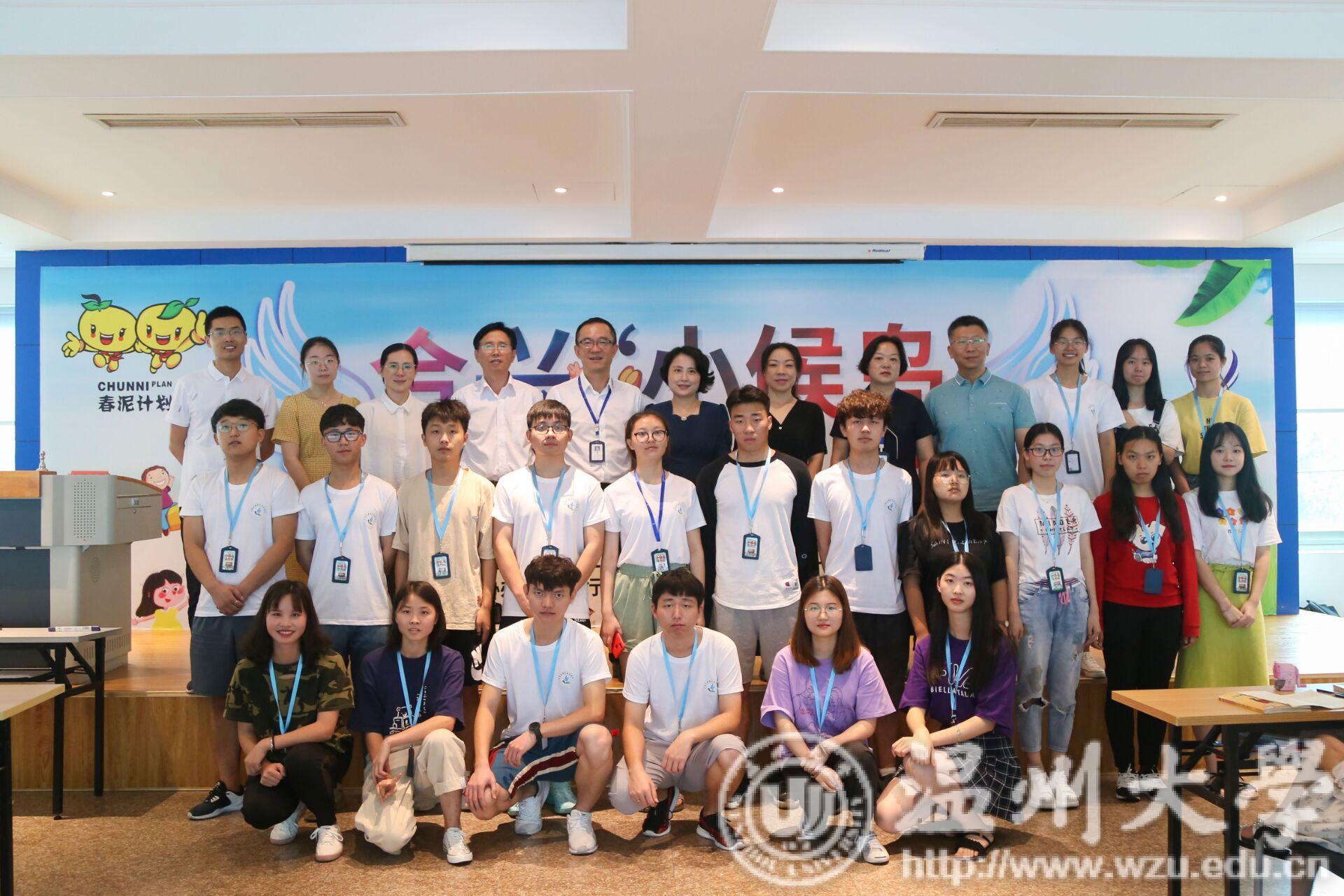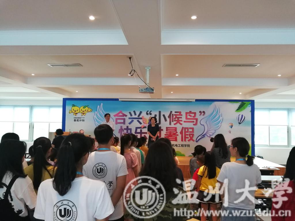 今天上午九时许,永利集团小候鸟暑期社会实践队在合兴集团隆重举行了第六期“小候鸟”暑假班的开班仪式。出席开班仪式的有公司党委副书记黄玮老师、团委书记朱秀微老师、机械电子系副主任任明老师、员工科辅导员杨奇老师、胡施施老师、乐清市总工会党组成员女职委主任卢建玲女士、虹桥镇文明办主任陈万德先生、合兴集团汽车总经办赵浙峰先生、合兴集团党委书记张守奎先生,还有来自温大实践队的39位小老师们,以及来自全国各地的128位小候鸟们。