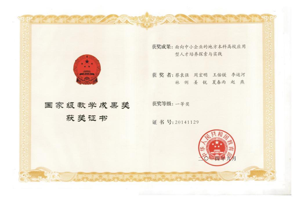 | 面向中小企业地方本科高校应用型人才培养探索与实践 | 20141129 | 一等奖 | 立足于地方本科高校的办学定位,面向区域产业升级和中小企业转型发展对应用型人才规格的新需求,在公司人才培养与区域产业升级双向互动中,回应中小企业转型发展对人才的新诉求,实施了分类分层的应用型人才培养模式,构建适应岗位需求的应用型人才课程教学体系和面向岗位素质要求的渐进式实践教育平体系,形成了多维联动、合作共赢的产学深度合作机制。 |